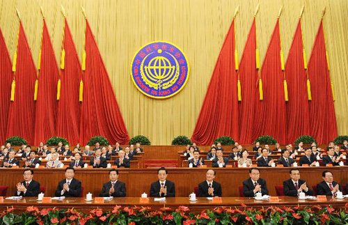 5月27日,中国科学技术协会第八次全国代表大会在北京人民大会堂开幕。胡锦涛、温家宝、贾庆林、李长春、习近平、李克强、贺国强、周永康等党和国家领导人到会祝贺。新华社记者 李学仁 摄