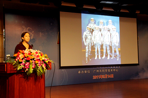 近日,美国国家航空局前女宇航员MARSHA S. IVINS(玛莎•艾文斯)应邀做客广州科普大讲坛,为广州市民讲述她的太空探索之旅。作为2011年科技活动周的重头戏,此次在广州青少年科技馆举行的“图说人类航天史”科普报告会得到群众和媒体的热捧,广州地区十几家主流媒体及近千名市民的参加了当天的报告会。活动由广州市科协、广州日报社、广州市全民科学素质工作领导小组办公室主办,广州市科学技术中心承办,广州市合力科普基金会协办。