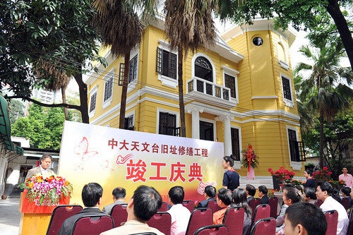 有80多年历史的中大天文台旧址是广东省文物保护单位,在广东省科协的大力支持下,广东科技报社通过不断努力,中大天文台旧址修缮工程终于在2010年由省发改委立项并得到省财政厅的专项资金支持,于2011年6月开工,2011年10月顺利竣工。11月11日,中大天文台旧址修缮工程竣工庆典召开。中国科学院院士、华南师范大学原校长刘颂豪院士,省科协党组书记、副主席梁明等领导出席庆典。