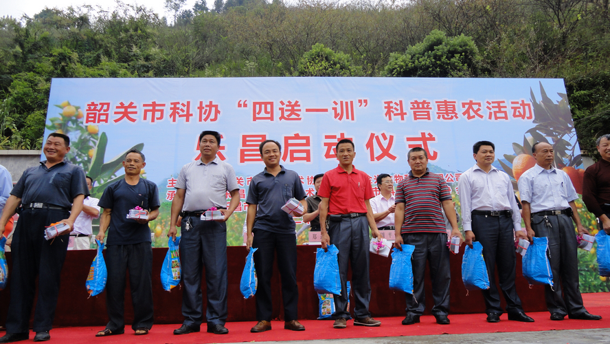 韶关市科协党组书记、主席郑适、副主席罗金锋、周平,乐昌市副市长郑扬帆、“四送一训”科普惠农活动全国推广办主任金明基等领导和韶关市有关县(市、区)科协领导参加了启动仪式,并为科技示范户、科普带头人免费发放了光盘、技术资料、生物肥料。