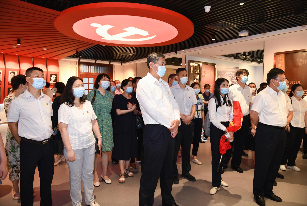 在中共三大会址纪念馆广场,郑庆顺同志带领全体党员重温入党誓词。随后在讲解员引领下,参观了大会历史陈列展览,听取中共三大召开的历史背景、会议过程与成果、会议影响与贡献、代表理想的升华四个专题的介绍,观看了全息影像沉浸式场景《共识·1923》,参观108件(套)满载着革命历史的珍贵文物。