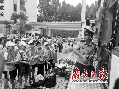 在广州市桥消防中队的消防车前面,一名消防战士被同学们团团围住,像明星般在给同学们“签名”。凑近一瞧,他在练习本上写下的是“雷达生命探测仪、无齿锯、机动链锯、空气呼吸器、钢筋速断器……”身旁的一名刘同学告诉记者,他们要写一篇有关消防知识的活动日记,所以求助兵哥哥帮忙写下这些生涩的专有名词。