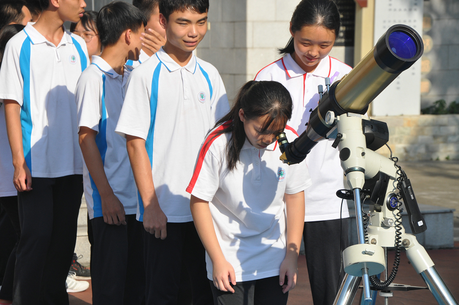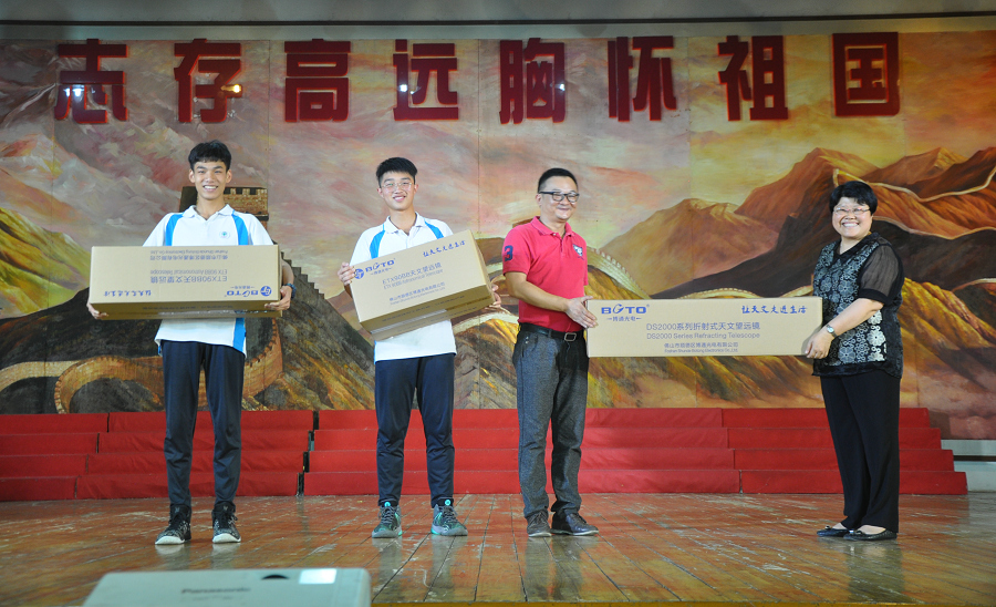 紧接着,领导嘉宾为广东省科普中心与佛山市顺德区博通光电有限公司共建体验式科普基地揭牌。博通光电有限公司科普基地向容山中学赠送两台天文望远镜。