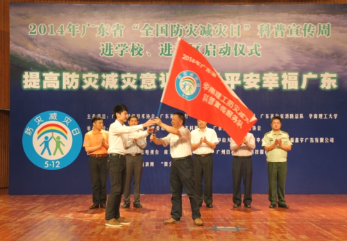 由广东省科协、省教育厅、省地震局、省气象局、省公安消防总队等联合主办的2014年广东省“全国防灾减灾日”科普宣传周进学校、进社区活动启动仪式,在华南理工大学广州大学城校区举行。活动以“提高防灾减灾意识,建设平安幸福广东”为主题,通过开展专题科普讲座、防灾减灾科普剧表演及文艺演出、大学生创新作品展等主会场活动,营造全社会科学防灾减灾的良好氛围。