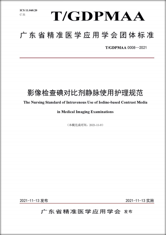 成立大会上正式发布了《影像检查碘对比剂静脉使用护理规范》团体标准。该标准由广东省精准医学应用学会归口,由中山大学孙逸仙纪念医院提出,多家医院、生物医药科技企业和广东省标准化研究院等共同参加了起草工作。编写组历经多轮讨论修订,终获正式发布。