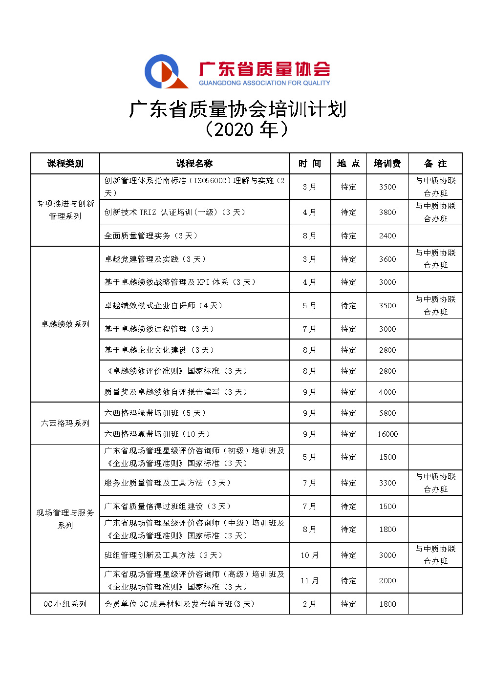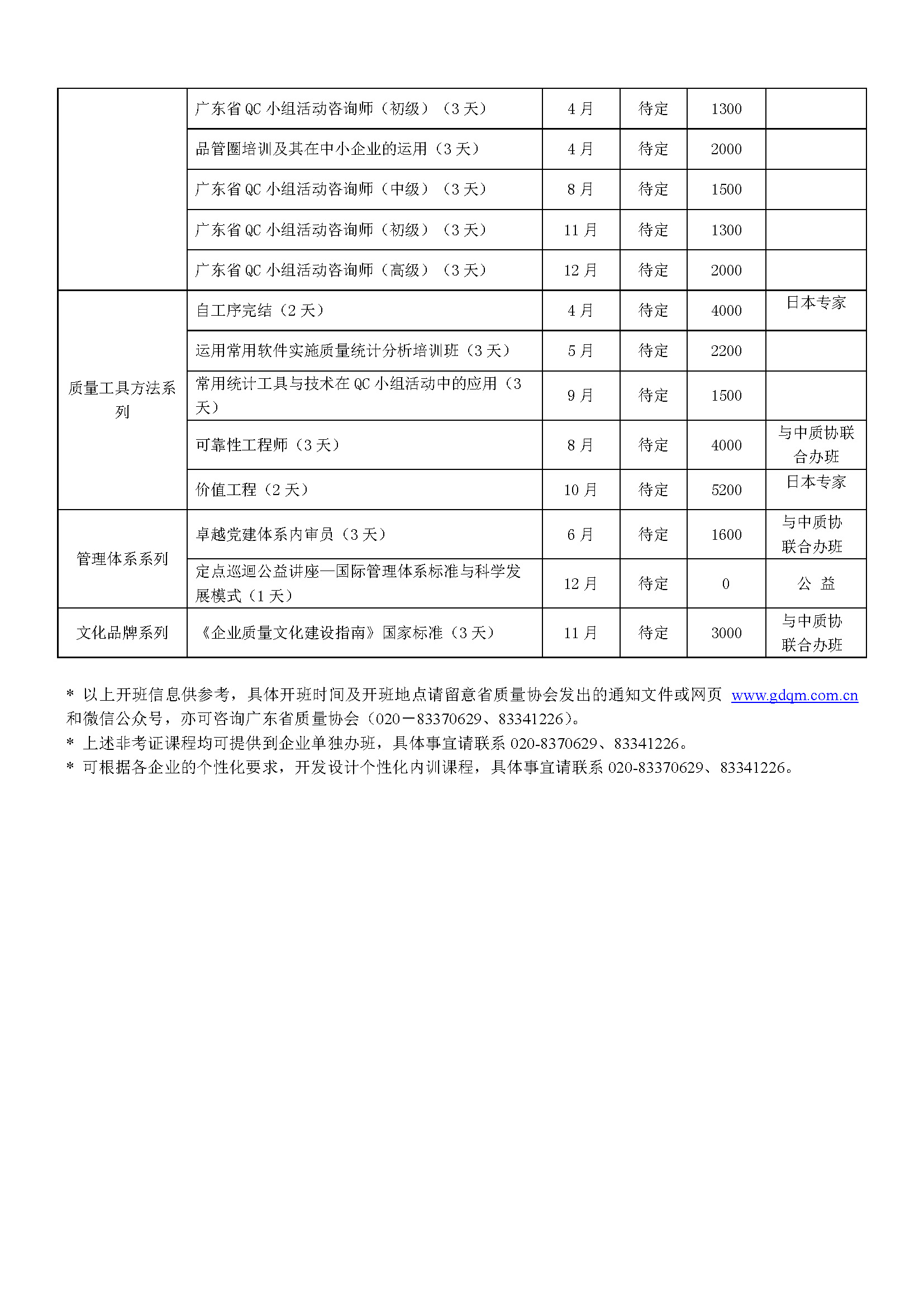 2020年广东省质量协会培训计划